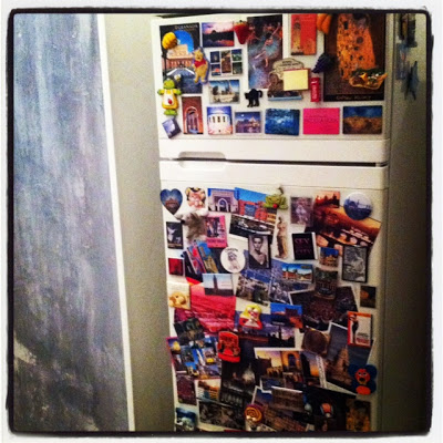 Il frigo con i magneti comprati in viaggio, le cartoline e i biglietti di musei e cinema