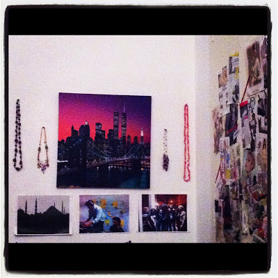 La parete tra l’armadio a muro e la finestra, con le foto, il quadro di NY e le mie collane appese al muro