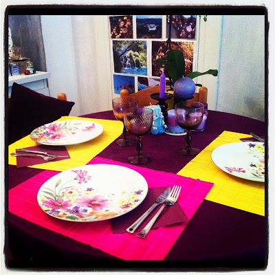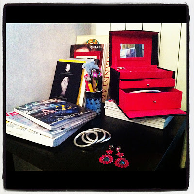 Il suddetto tavolino con in primo piano i miei nuovi orecchini e i miei bracciali presi in India